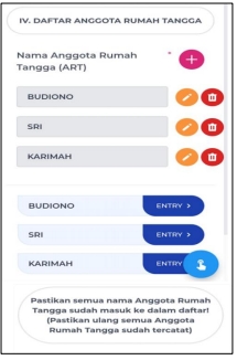 1️⃣ Tekan tombol “+” untuk memasukkan semua nama ART ke dalam daftar dan isikan nama setiap ART dalam huruf kapital. Untuk nama KRT, pastikan nama yang dimasukkan ke dalam daftar sama dengan nama KRT di Blok I Rincian 9. 2️⃣Setelah dipastikan semua nama ART sudah masuk ke dalam daftar, tekan tombol “ENTRY” untuk mulai mengisi data detail dari setiap ART.