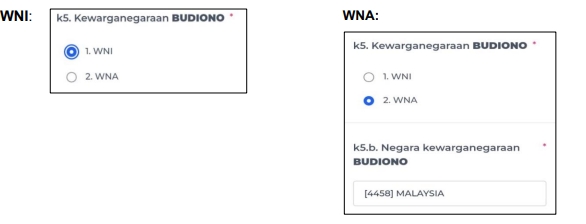 Untuk anak-anak yang memiliki kewarganegaraan ganda (belum berusia 18 tahun atau belum kawin) karena orang tuanya memiliki kewarganegaraan berbeda, pilih salah satu kewarganegaraan berdasarkan informasi dari orang tua atau responden.