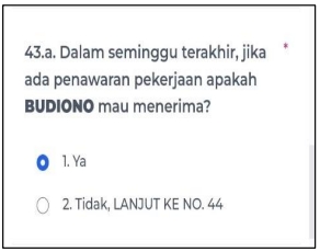Bila responden menjawabnya dengan persyaratan tertentu seperti “lihat dulu gaji/upahnya” atau dengan ”menanyakan jenis pekerjaannya” atau dengan syarat lainnya atau dengan menambahkan kata-kata alasan seperti ”apabila ...., namun ....tergantung ..... ” maka responden tersebut dikategorikan sebagai tidak mau menerima penawaran pekerjaan (Nomor 43.a=2).