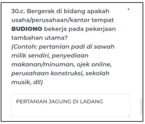 Isian dari pertanyaan ini digunakan untuk mengidentifikasi lapangan pekerjaan tambahan utama sehingga harus diisi sejelas mungkin. Tata cara pengisian pertanyaan ini sama dengan tata cara pengisian pada pertanyaan 13.c13c. Bergerak dibidang apakah usaha/perusahaan/ kantor tempat (NAMA) bekerja?