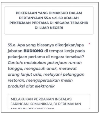 Pertanyaan ini mengidentifikasi lapangan dan jenis pekerjaan pertama ART di negara ART terakhir bekerja di luar negeri.