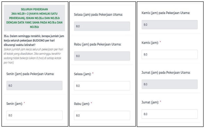 Cara pengisian pertanyaan ini sama dengan cara pengisian pertanyaan nomor 19.a. Isikan jumlah jam kerja dari seluruh pekerjaan selama seminggu terakhir pada kotak yang disediakan, disesuaikan dengan hari pencacahan.