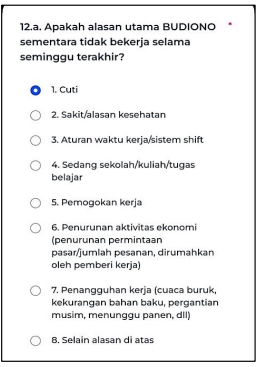Pertanyaan ini bertujuan untuk memperoleh informasi alasan utama seseorang sementara tidak bekerja selama seminggu terakhir.