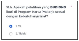 Jawaban berkode 1 (Ya), jika responden merasa sekurang-kurangnya 1 (satu) pelatihan Prakerja yang diikuti sesuai dengan kebutuhan atau minatnya.