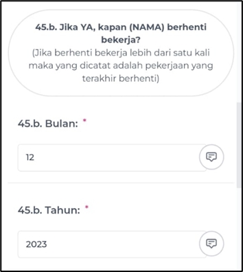 Jika berhenti bekerja dalam periode setahun terakhir, maka ditanyakan bulan dan tahun berhenti bekerja tersebut. Isikan dalam kotak bulan dan tahun yang telah disediakan.
