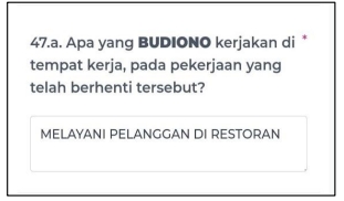 Penjelasan mengenai apa yang dikerjakan di tempat kerja sama dengan penjelasan di pertanyaan nomor 13.a, tetapi yang dimaksud di sini adalah apa yang dikerjakan pada pekerjaan sebelum pekerjaan/kegiatan saat ini.